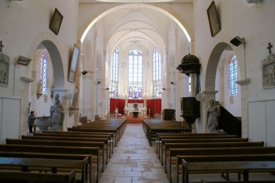 Le chœur a été édifié à la Renaissance, avec une abside à trois pans éclairée par trois grandes baies à réseau du XVIe s. ; statue de la Vierge à l’Enfant, vitrail des Donateurs en 1863, donné par le maître verrier Lafaye.