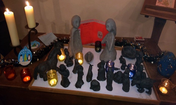A 20h, après un repas partagé, une quarantaine de personnes se retrouvaient pour commencer une veillée en entonnant le chant Noël des enfants du monde. Les enfants très fiers d'eux ont présenté les fruits de leurs ateliers. En silence, nous avons écouté le texte La Gratuité d'un Amour de Frère Elie Maréchal :