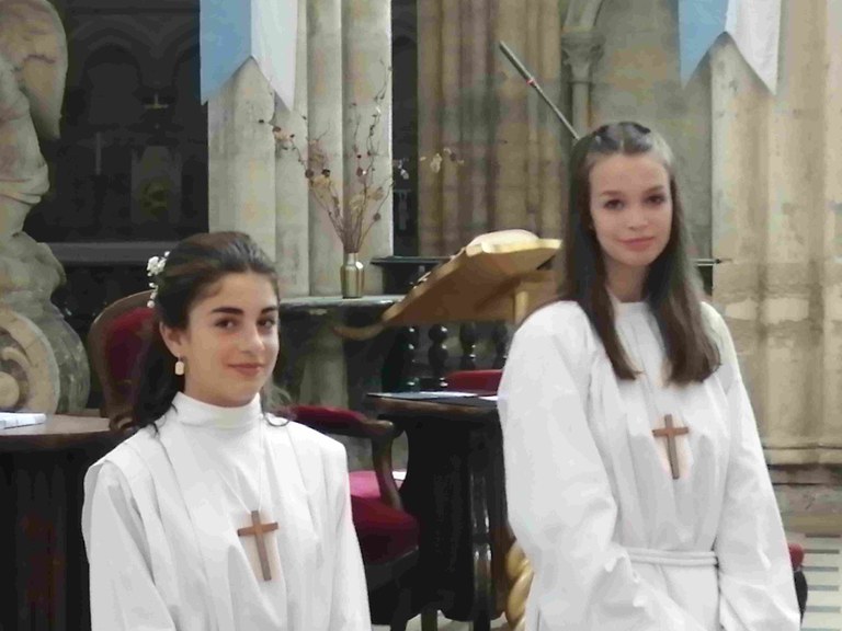 Le 19 juin , fête du Saint Sacrement, deux fidèles servantes d'autel dont les visages nous sont connus, Salomé et Agathe, communiaient pour la première fois au corps du Christ au milieu de leurs familles et de l’assemblée dominicale qui les entouraient. Le chant de méditation suivant la communion faisait écho à ce moment vécu dans une forme de solennité par les deux adolescentes: "Dieu se livre lui-même en partage par amour pour son peuple affamé" et "aujourd'hui il allume une flamme pour que nous l'aimions jusqu'au bout": beau programme de vie pour Agathe et Salomé mais aussi pour chacun de nous...