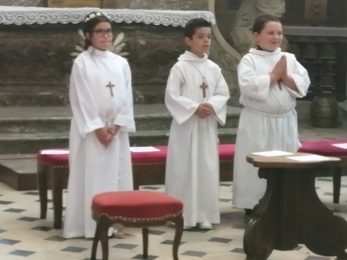 Trois jeunes servants d'autel, Louise, Tiago et Raphaël, ont fait leur 1ère communion lors de la messe dominicale du 10 juillet, entourés de leurs familles et de la communauté. Avec le sérieux de leur âge, ils ont reçu le corps du Christ tandis que Marion recevait le cordon rouge pour sa présence fidèle depuis de nombreuses semaines au service de l'autel.