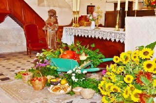 En ce dimanche 28 août, fête de Saint-Fiacre, ce n'était pas l'odeur de l'encens que l'on respirait dans l'église de Villevallier mais bien celle des fruits, légumes et fleurs qui décoraient d'une façon particulièrement belle et harmonieuse la petite église. Une façon de célébrer le Saint patron des jardiniers et la beauté de la.Creation. L'assistance était nombreuse et l'église était quasiment pleine, toute nimbée du soleil de cette fin d'été.. Le père Romain, tout juste revenu de Lourdes le matin même, à béni cette abondance de fruits de fleurs et de légumes que le Créateur a mis à la disposition de l'homme, rappelant combien cette création est fragile et combien il nous revient de la préserver. Les paroissiens et les adhérents de l'association des amis de l'église de Villevallier avaient en effet particulièrement soigné le décor au pied de l'autel, faisant de cette belle célébration une vraie fête pour les yeux. Un verre de l'amitié était offert à la sortie de l'église qui a réuni des participants heureux