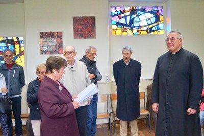 Anne Marie Filipi, au nom de la communauté, a retracé le parcours du Père Grégoire depuis son ordination à Cracovie en 1989 jusqu'à sa venue dans notre paroisse.