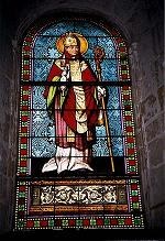 - L’arbre aux branches desquelles il suspendait ses trophées de chasse et en face, saint Amâtre lui reprochant cette coutume païenne.