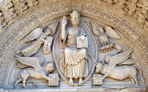 Qui sont-ils ce quatre Vivants qui nous renvoient au chapitre premier du livre d’Ezéchiel? Au cours de l’histoire, nous les avons souvent identifiés aux quatre évangiles, mais il faut aller chercher la réponse chez saint Ambroise de Milan affirmant que c’est « Notre Seigneur qui, dans les quatre évangiles, est figuré par les symboles des quatre animaux » symbolisant l’humanité, la royauté, le sacrifice et la résurrection. Ces quatre Vivants qui entourent le Trône de toute part, c’est donc une image de l’unique Christ rassemblant en Lui toutes les Puissances et toutes les réalités autrefois dispersées. Il Est, Lui, la Récapitulation de toute chose, l’histoire humaine dans laquelle toutes nos histoires singulières trouvent leur achèvement, l’unique réalité dans laquelle toutes les nôtres peuvent s’épanouir, l’unique louange au Père dans laquelle toutes nos louanges trouvent leur juste ton. Nous le comprenons en reprenant le fil du récit de la vision : « Jour et nuit, ils ne cessent de dire : « Saint ! Saint ! Saint, le Seigneur Dieu, le Souverain de l’univers, Celui qui était, qui est et qui vient. » Souvenons-nous des Préfaces introduisant la prière eucharistique; elles sont une invitation à entrer dans la louange du Ciel qui est contenue dans la louange éternelle allant du Fils au Père… Ces Préfaces redisent toutes que c’est « par le Christ, notre Seigneur », que nous rendons gloire au Père avec les anges, les archanges, les puissances et les esprits bienheureux; elles nous font entrer dans ce chant des quatre Vivant qu’est le Sanctus : « Saint ! Saint ! Saint, le Seigneur Dieu… »
