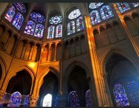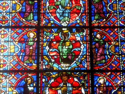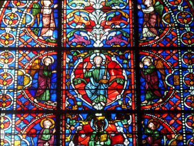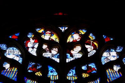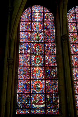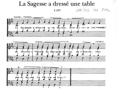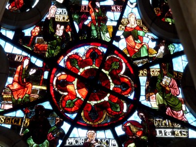 Dans le chœur de la cathédrale, tout en haut au fond à gauche une "Rose" (au-dessus des lancettes figurant saint Germain et saint Étienne) illustre, dans le cercle interne, les huit vertus dont la sagesse (sapientia, en haut de la photo); ce vitrail date de 1240-1250 (restauration partielle en 1869). Le chant peut aussi illustrer la sagesse: "La Sagesse a dressé une table", très beau chant de communion que nous prenons de temps à autre dans nos églises.