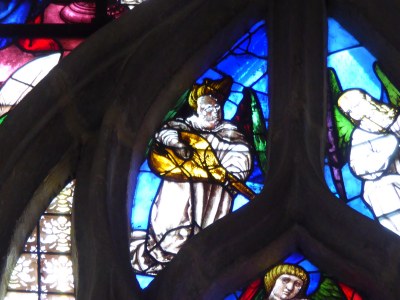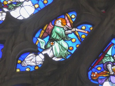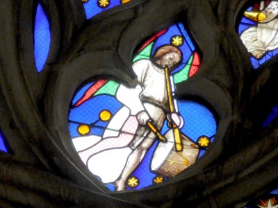La cathédrale d'Auxerre est riche en représentations "d'anges musiciens" (près d'une soixantaine!). Parmi ceux-ci, voici le "galoubet" et le tambourin (le "concert céleste" à la grande rose de la façade, tout en bas,1550), la flûte traversière au même vitrail (cercle intérieur, en bas), la harpe (transept nord, "ajour" sous la grande rose en bas à droite, 1528), et le luth ( transept nord, face ouest, tout en haut: rose de la Vierge à l’Enfant, "ajour" à la partie inférieure, début XVIe siècle).