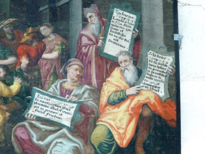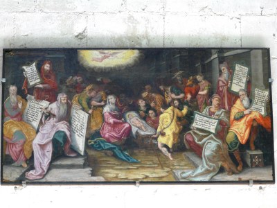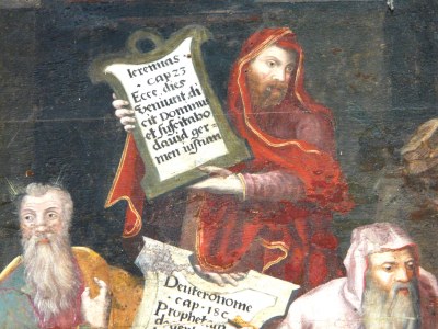 Nous entrons dans le temps de l'Avent, attente de la venue du Sauveur. Dans la cathédrale d'Auxerre, figure, discrètement "perché" à l'entrée à droite tout en haut, un tableau illustrant la Nativité (XVIIe siècle) ; curiosité inhabituelle, semble t-il, l'artiste a représenté six prophéties de la venue du Messie, en voici quatre en "gros plan": Zacharie, Michée, Ézéchiel, Jérémie.