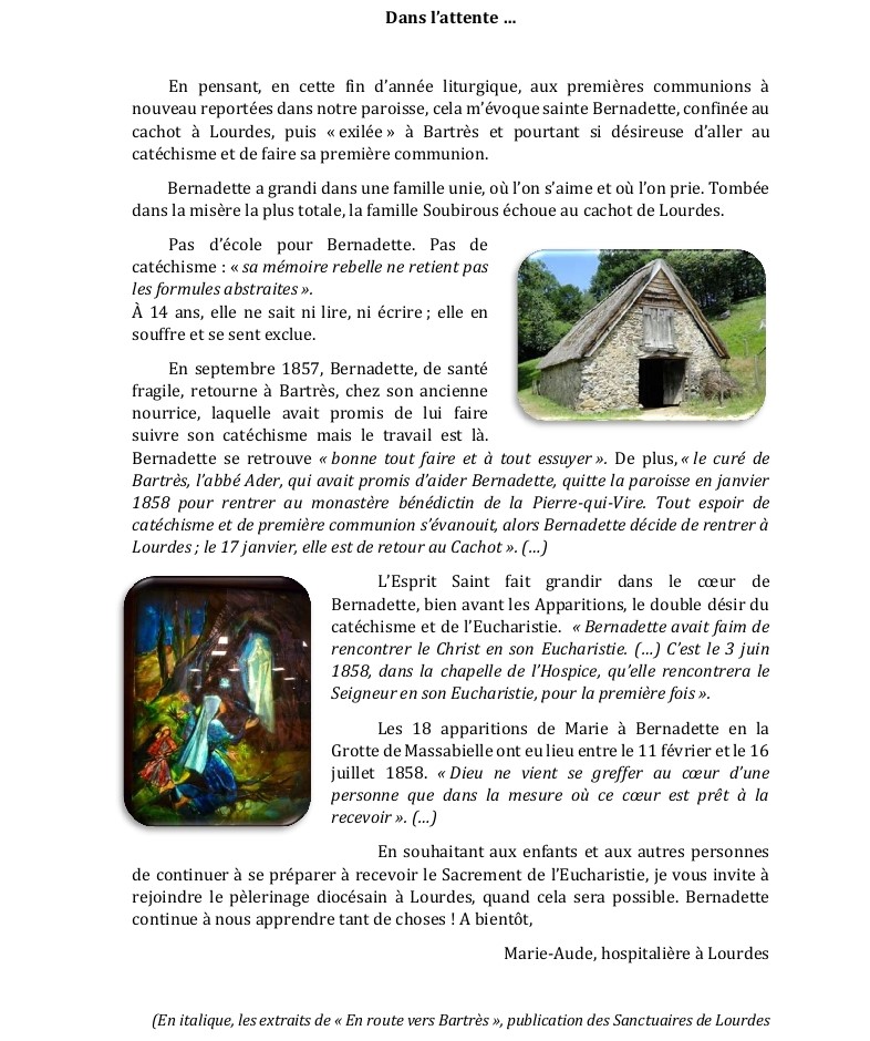 En ce temps de confinement, les grands servants d'autel vous aident à prier d'une autre façon en vous offrant cette vidéo de la prière de l'Angélus afin de rester fidèles dans le service de la prière.Chers amis, notre isolement recommence et risque de durer… C’est triste, mais c’est pour la bonne cause, alors l’EAP a créé sur le site de la Paroisse une page intitulée « la page des messages (le retour)». Elle sera un peu à l’image de nos pèle-mêles familiaux, un espace dédié à l'affichage des petits messages du quotidien que nous voudrions adresser à toute la communauté paroissiale.