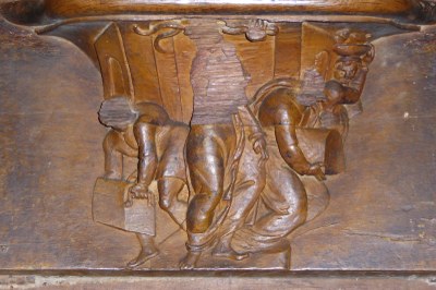 Cette scène est illustrée dans les stalles de la cathédrale d'Auxerre: la miséricorde de la stalle n° N34 (côté nord), malheureusement endommagée.