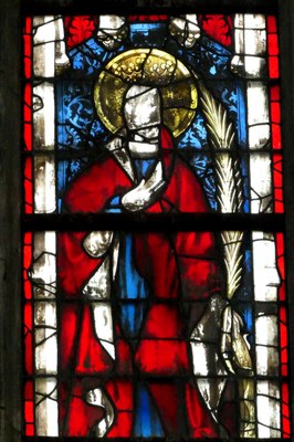 Voici un autre aspect de ce vitrail: tout en haut on y voit la Sainte Trinité avec une banderole où l'on peut distinguer (avec un peu de peine!) l'inscription