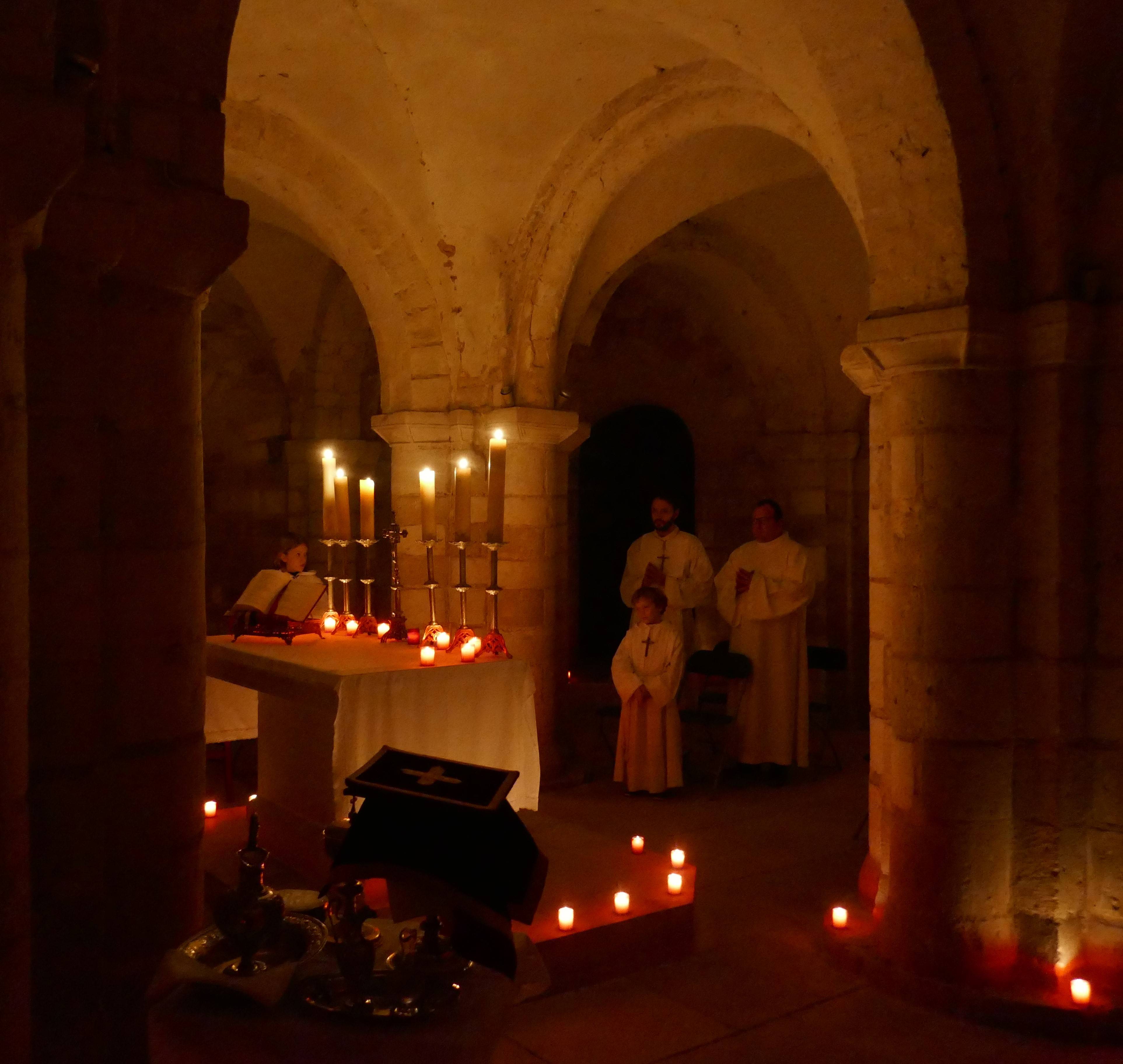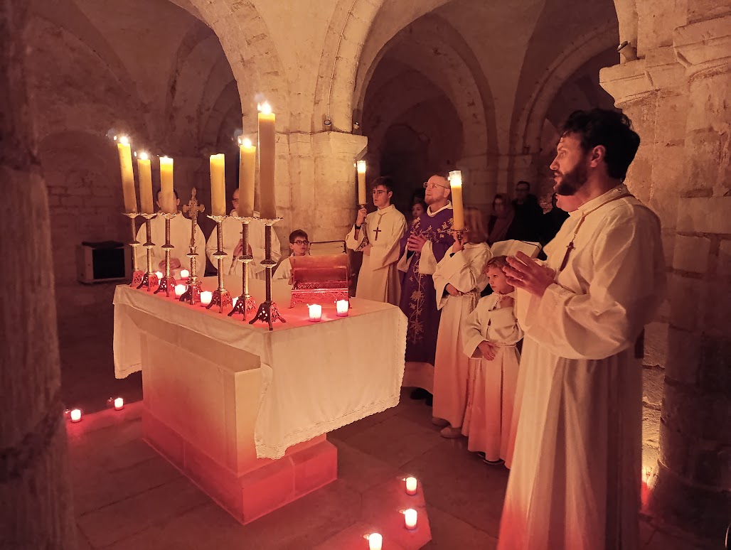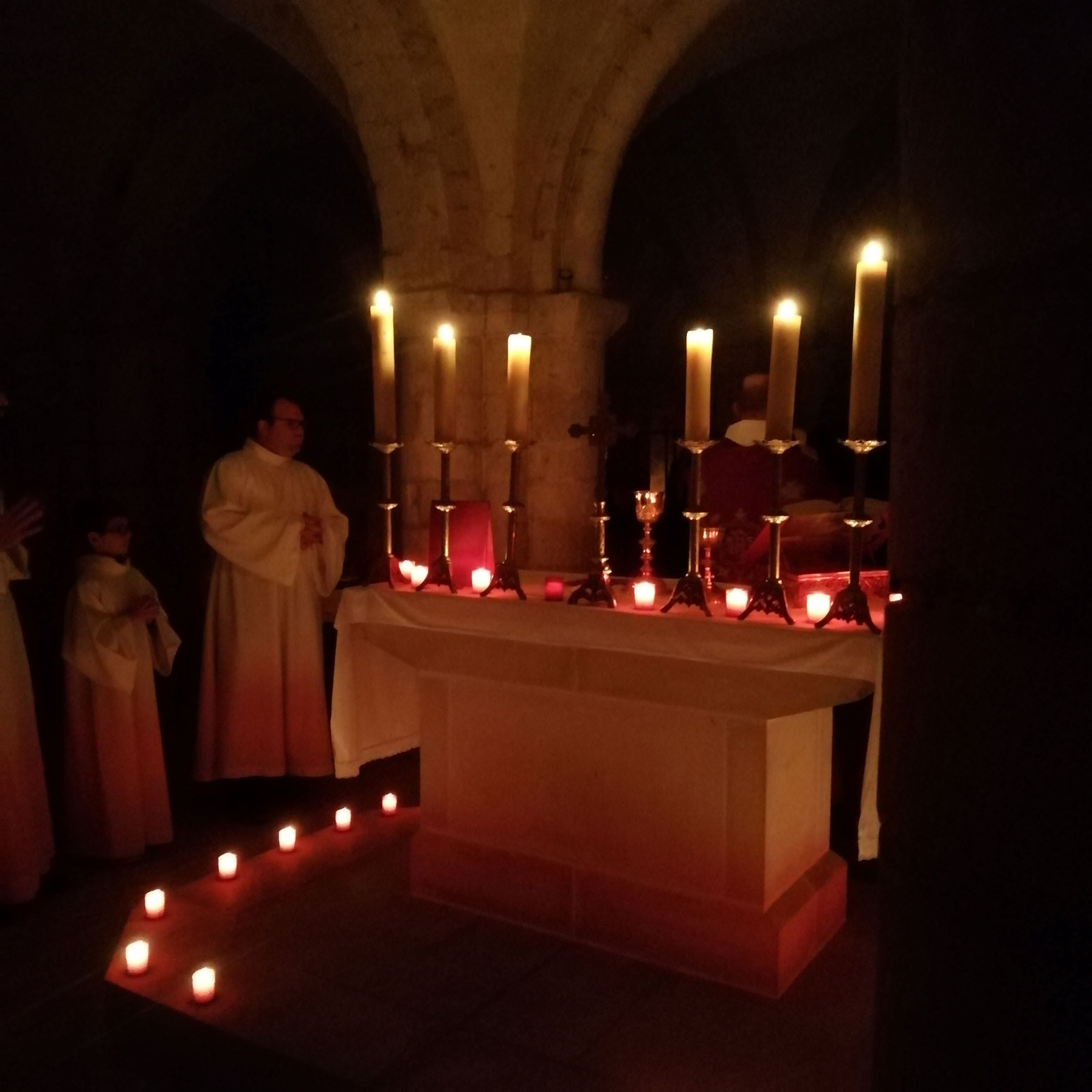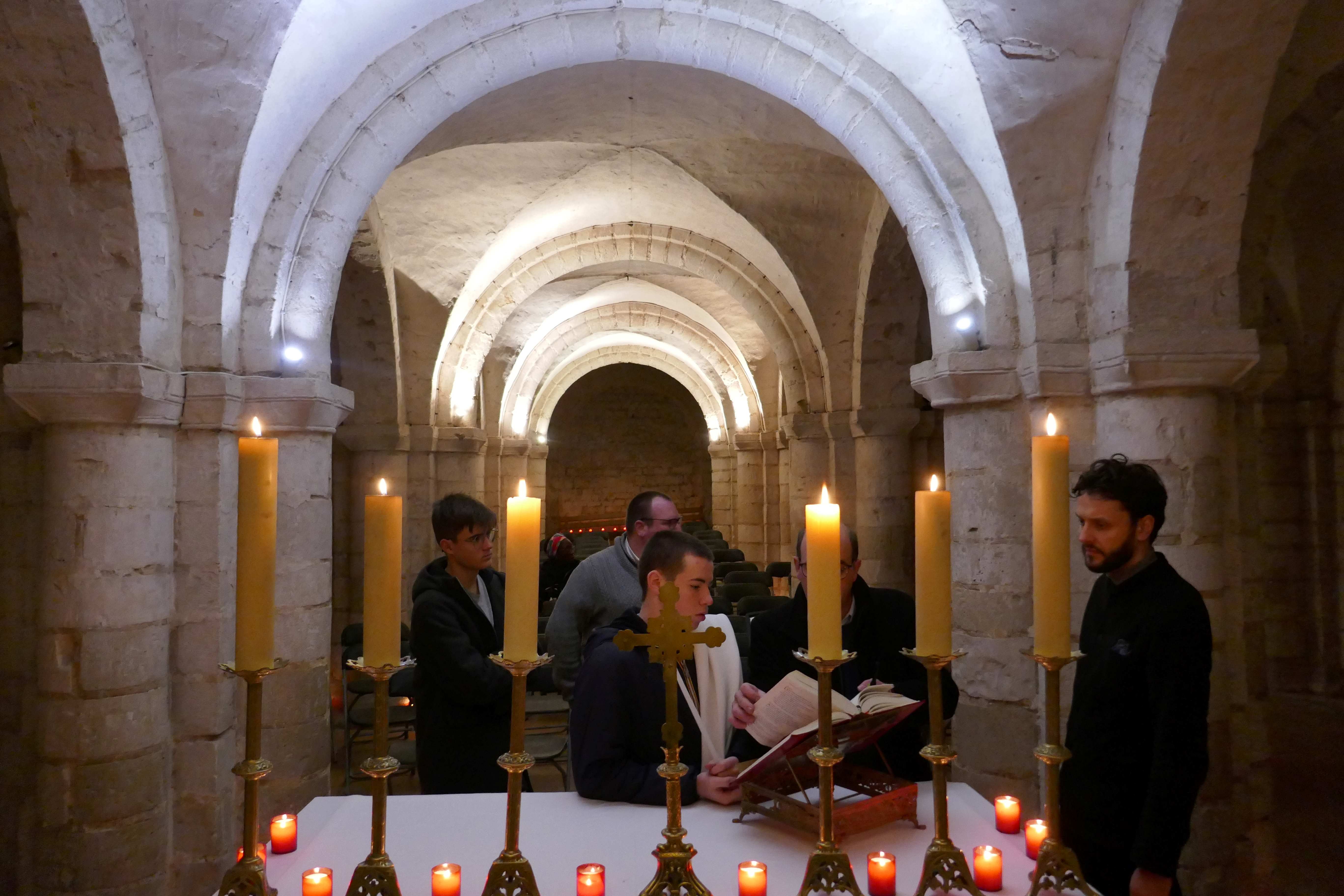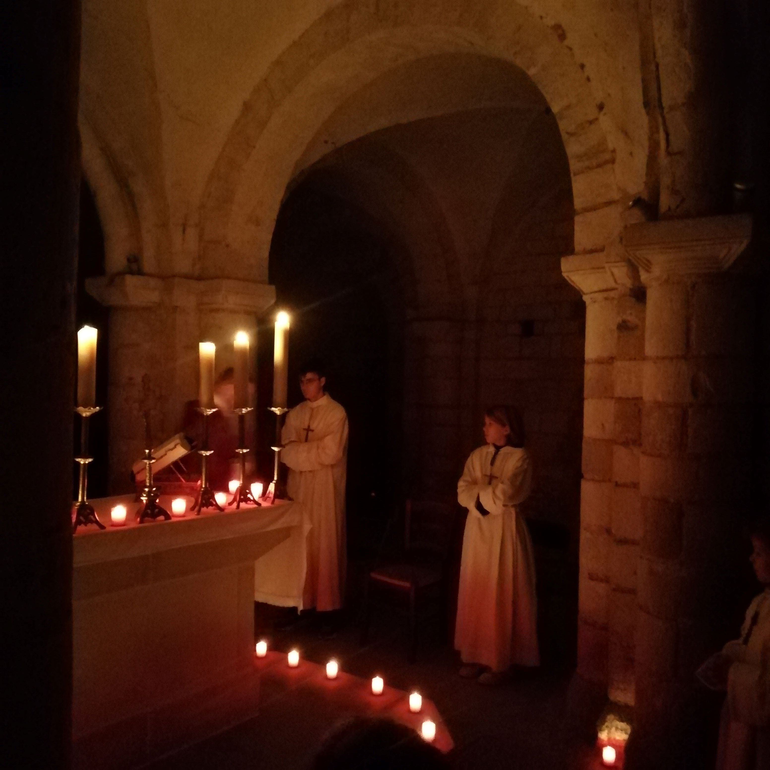 Les grands servants d’autel se sont donc retrouvés la veille pour installer les dizaines de veilleuses dans toute la crypte afin de magnifier le lieu d’une douce lumière. Il fallait également descendre tous les objets liturgiques, préparer les livres, chercher les bonnes pages dans le lectionnaire de semaine ou encore une messe votive pour la Sainte Vierge dans le missel romain. Cela constitua également un véritable temps de formation.