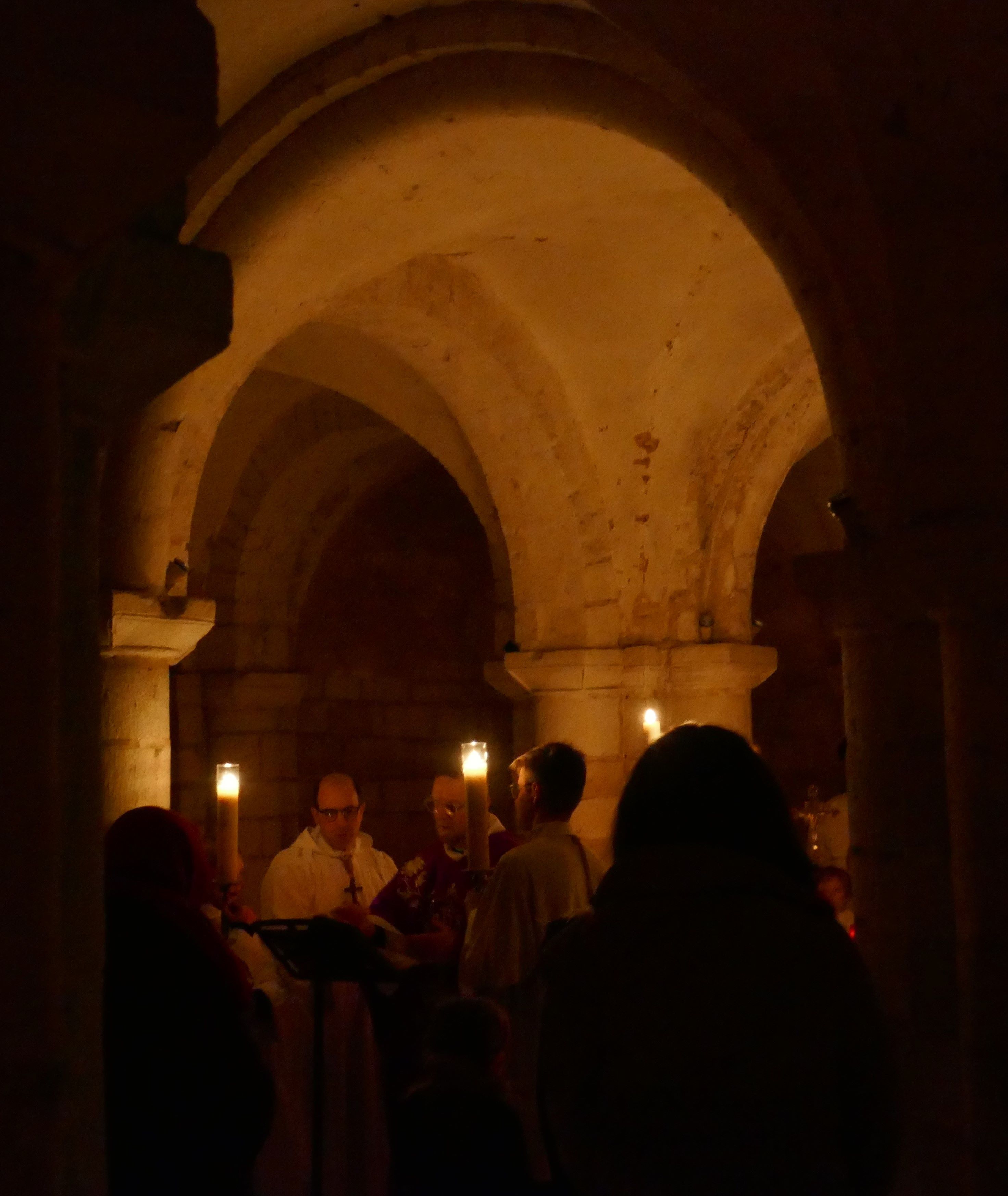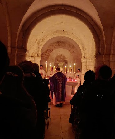 Pour cette messe, deux choix ont été faits. Le premier était de profiter du joyau architectural qu’est la crypte de la cathédrale. Le second choix était de célébrer la liturgie de l’Eucharistie ad orientem, ainsi l’assemblée tout entière, y compris le prêtre, se tourne vers le Seigneur qui va venir et à l’heure où justement le soleil se lève. Le symbole était particulièrement fort de sens.