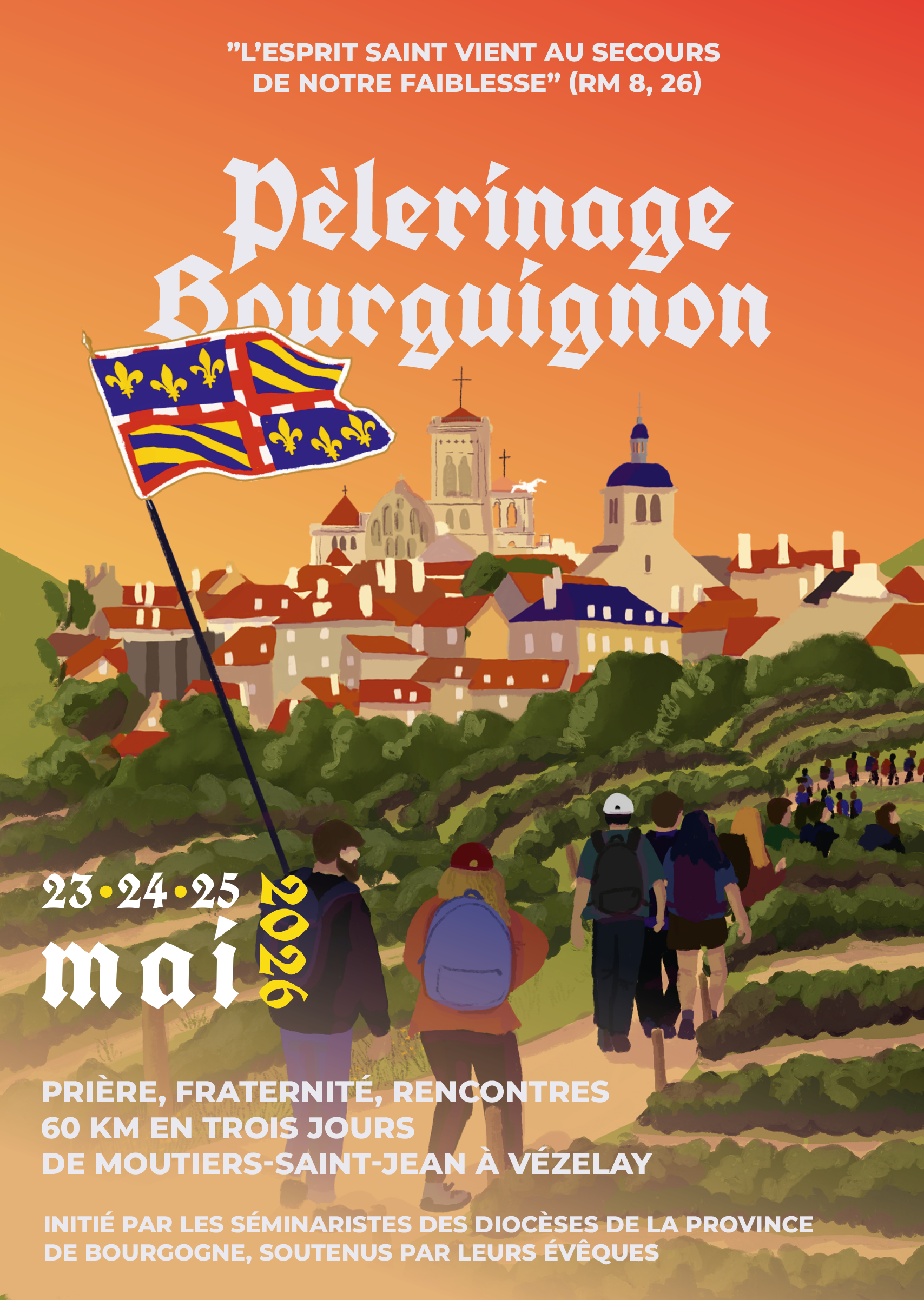 Porté par des séminaristes et des jeunes catholiques de notre terre bourguignonne soutenus par leurs évêques, ce pèlerinage sera vécu sur les pas des saints qui nous ont précédé. Pour faire souffler l’Esprit Saint sur notre sainte Bourgogne, venez marcher avec nous jusqu’à la millénaire basilique de Vézelay !