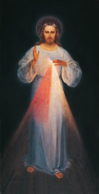 Un soir, alors que j’étais dans ma cellule, je vis Jésus vêtu d’une tunique blanche, une main levée pour bénir, la seconde touchait son vêtement sur la poitrine. De la tunique entrouverte sur la poitrine sortaient deux grands rayons, l’un rouge, l’autre pâle. En silence, je fixais mon regard sur le Seigneur, mon âme était saisie de crainte, mais aussi d’une grande joie. Après un moment, Jésus me dit : “Peins un tableau selon le modèle que tu vois, avec l’inscription : Jésus, j’ai confiance en Toi”.