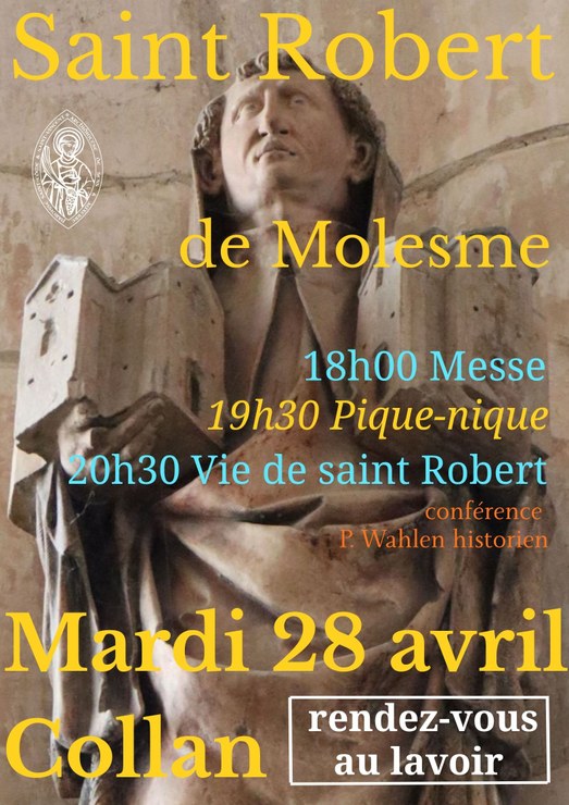 - La paroisse Saint-Edme et Saint-Vincent fête Saint-Robert de Molesme (fondateur de Citeaux) à quelques jours de l'anniversaire de son décès (17 avril). Nous nous retrouverons à Collan et nous cheminerons sur le lieu de son ermitage dans la forêt.