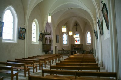 De style ogival, reconstruite en 1847, en forme de croix latine : bas relief en pierre de la résurrection de Lazare, toiles de la vision de St Hubert et de la naissance de la Vierge 18° ; toile du départ de Rebecca 16°.