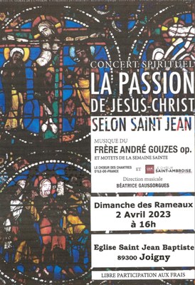 - Dimanche des Rameaux à 16h à l'église St Jean-Baptiste, concert spirituel : La passion de Jésus-Christ