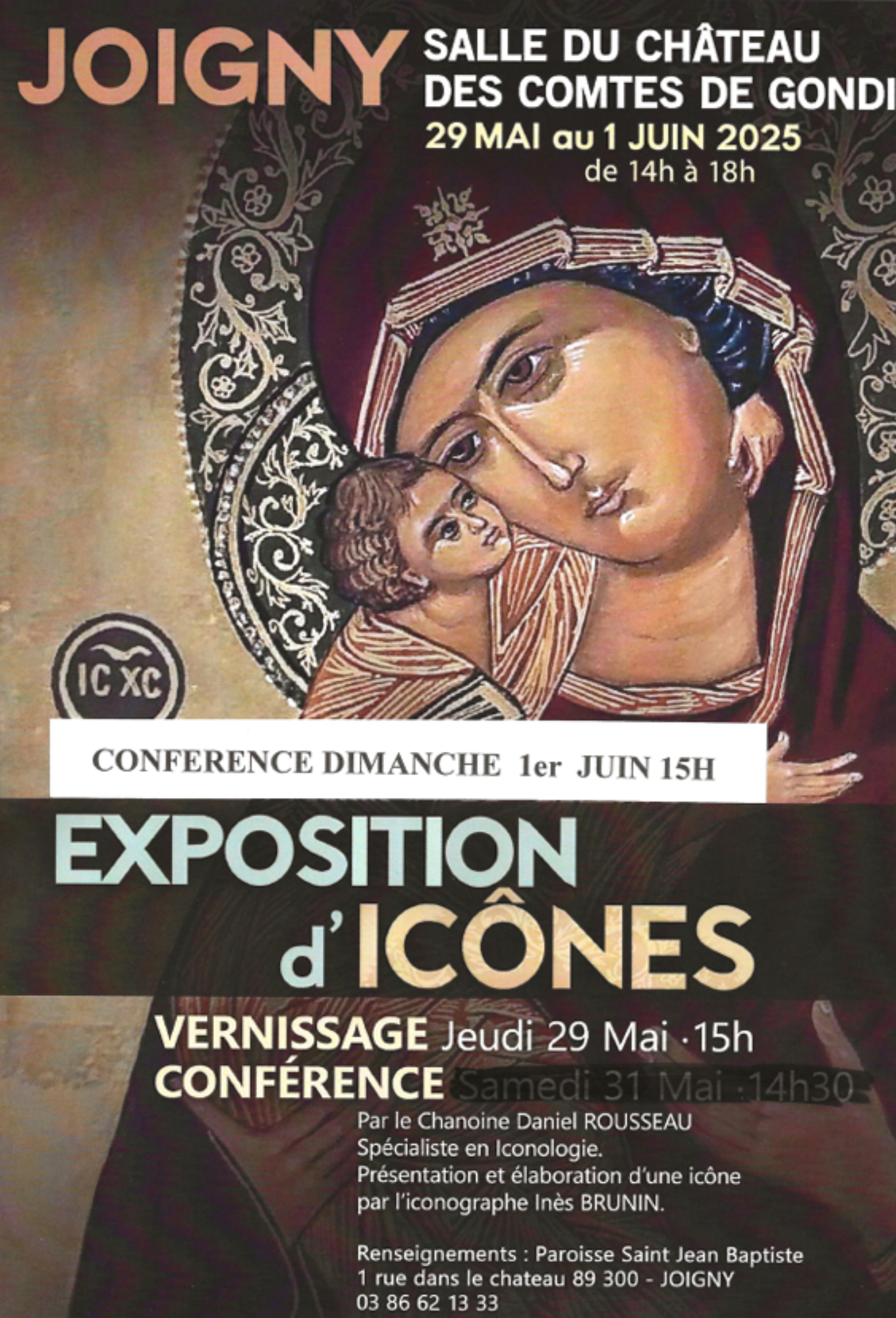 - Jeudi 29 mai à 15h00, inauguration de l’exposition d’Icônes qui se tiendra dans la salle du Château du Comte de Gondi. La présentation des œuvres se tiendra jusqu’au 1er juin. Dimanche 1er juin à 15h00, conférence par le chanoine Daniel Rousseau, spécialiste en iconologie.