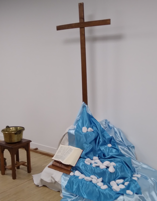 Tous les participants, ont bâti et symbolisé la pierre angulaire du royaume de Dieu, par l'apposition solennelle et en chantant, de beaux cailloux au pied de la croix.