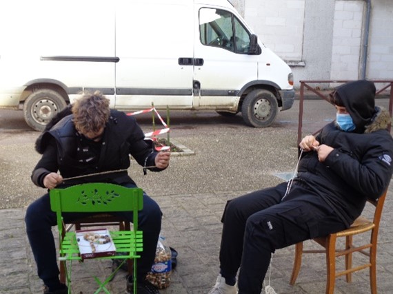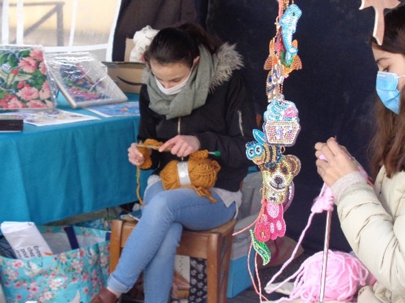 Dimanche 13 février au matin, rendez-vous sur la place de l’église de Charny. En attendant les clients à notre stand, nous fabriquons des chapelets et nous nous initions, volontairement, au tricot pour mener à bien un projet.
