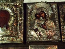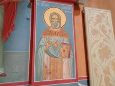 La vie d’Alexis Medvedkov (d’Ugine) : il naît le 1 juillet 1867 à Fomistchevo, nord de la Russie et étudie au séminaire de St Pétersbourg. Il sera ordonné prêtre en 1895. Homme de prière, joyeux, doux et patient, il parle avec flamme, sa voix est forte quand il prit ou chante. Il décède en 1934. En 1956, lors du déplacement des cercueils dans un nouveau cimetière, ils découvriront le coprs d'un homme intact. Visage et mains de cire, vêtements sacerdotaux, croix dorée et évangéliaire ne présentent aucune altération. Pourtant le cercueil lui-même est complètement décomposé, le corps est au contact de la terre froide et humide depuis 22 ans. Lors du déplacement du corps, ils s’aperçoivent qu’il est toujours souple et qu’ils peuvent plier jambes et genoux, poignets… Saint Alexis est canonisé le 16 janvier 2004, solennellement proclamée à Paris le 2 mai 2004. Le 13 octobre 2004 les saintes reliques sont transportées de Sainte Geneviève des bois à Bussy en Othe et déposées dans l’église de la Transfiguration récemment construite, en plus de cette grande bénédiction, le même jour, les moniales apprennent que la coupole de l’église destinée à abriter les reliques allait être revêtue de fresques. Le Christ Pantocrator, entouré des armés célestes.