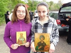 Puis, nous arrivons au monastère où nous sommes accueillis par le Christ transfiguré (en mosaïque) tout nouvellement installé. Une sœur nous invite à prendre un petit déjeuner avec eux avant de poursuivre par une procession jusqu’à la source miraculeuse, dans la forêt, pour la bénédiction de l’eau. On nous confie des icônes de Saints pour participer à la procession.