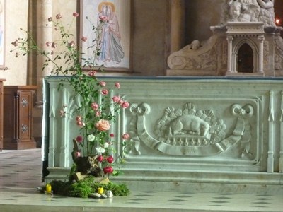 Il s’agit de celui qui se situe au fond de l’abside sur lequel a été placé fin XVIIIème une statue de la Vierge qui a remplacé celle d’avant la révolution. Il reste des éléments du XVIème comme ces motifs évoquant la vigne ce qui correspondait à l’activité agricole de l’époque dans la région.