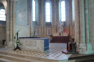 Il est à 7 pans dits pans d’abside : 5 au centre disposent d’une ouverture et 1 plus large, de part et d’autre, est muré. Les 5 baies simples ou lancettes sont surmontées chacune d’un arc formeret cintré de type normand. Les chapiteaux à motifs simples et à gros tailloirs (plateau polygonal qui couronne le chapiteau) sont d’origine et de premier ordre, car exécutés par un sculpteur de talent. On admirera aussi le profil des bases rondes des colonnettes.