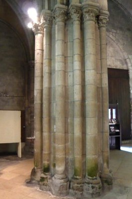En revanche on trouve bien dans cette nef l’alternance propre au gothique primitif de piliers « forts » et de piliers « faibles » jusqu’à la moitié de la nef, alternance que rappellent les fenêtres des bas-côtés. La seconde partie de la nef a été construite plus tardivement ce qui apparaît très clairement dans les piles régulières et nettement différentes de celles des deux premières travées.