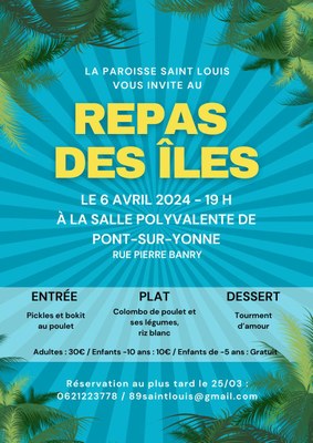 La Paroisse organise une soirée des Iles, venez nombreux et n'oubliez pas de réserver avant le 25/03/2024.