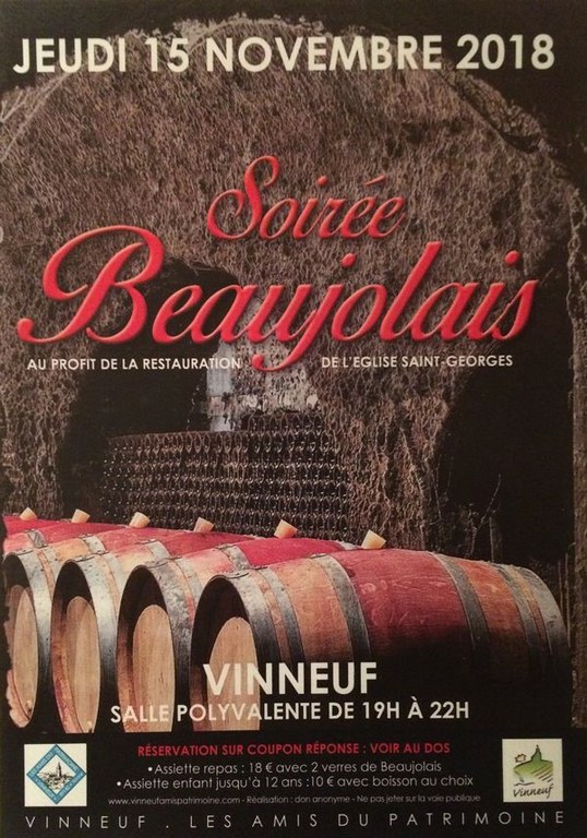 Le 15 novembre, Vinneuf-les Amis du Patrimoine ouvrait sa 4ème édition de la « Soirée Beaujolais », dans un décor évoquant la cave d’un collectionneur de bons vins de Bourgogne. Ce fut un agréable moment qui avait aussi pour but de récolter des fonds pour contribuer à la restauration en cours de notre église Saint Georges.