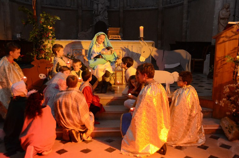 La messe de la Nativité de Jésus à Pont sur Yonne fut précédée par une courte veillée animée par les enfants. Le scénario consistait en la création d’une crèche par les enfants. Le père Samson leur déclina les « ingrédients » nécessaires : une Sainte Vierge, un saint Joseph, un enfant Jésus, des bergers etc… Et les jeunes de mettre en place les différents « éléments », accompagnés par des chants de Noël lancés par la chorale et repris par l’assemblée. Finalement, une vraie crèche bien vivante avec un joli Jésus plus vrai que nature, une sainte crèche prête à recevoir l’Emmanuel. « Notre Sauveur est né, alléluia ! » Photos : Paul Charmoy