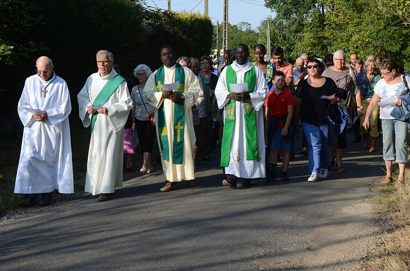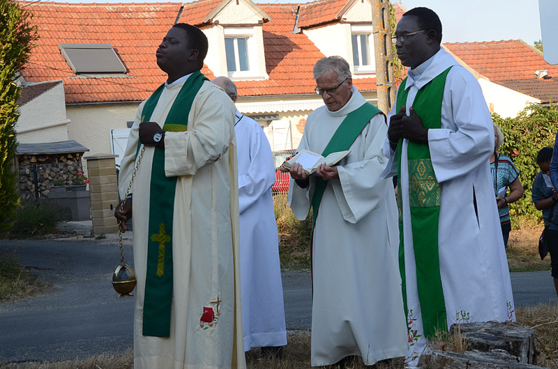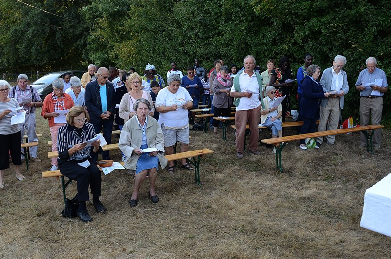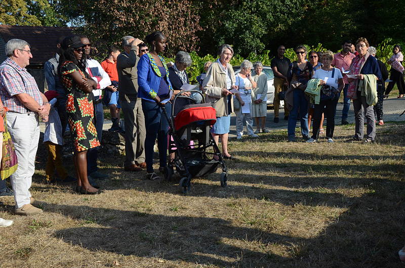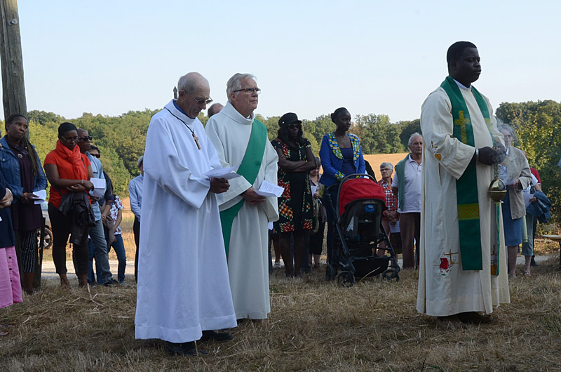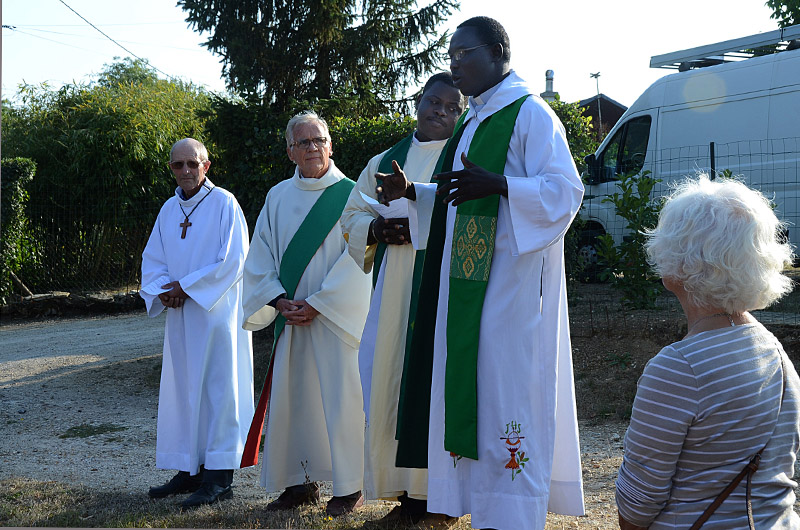 Nous étions plus d’une cinquantaine en cette fin d’après-midi du 1er septembre, à l’ancienne mare de Vaugouret, petit hameau près de Pont sur Yonne, pour le pèlerinage annuel de Saint Gilles. Des Pontois bien sûr, mais aussi de nombreuses personnes du secteur de Vinneuf, Vileneuve la Guyard, Villeblevin, et même quelques Parisiens, venus prier avec nous. La marche de quelques centaines de mètres qui nous séparait de l’oratoire de St Gilles, était symbolique, mais « ce qui compte, nous a dit le père Samson, c’est la démarche, c’est prier ensemble, c’est sortir de son quotidien pour donner quelques heures au Seigneur ». Cette année la petite communauté que nous formions était réunie autour de deux prêtres, les pères Samson et Dominique (venu du Sénégal cet été), et Alain Liévaut, diacre en région parisienne, souvent présent à nos messes de Pont.