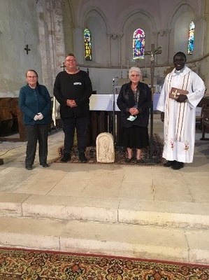 Son ouvre achevée, Jann appelle Mme Denise Brosseron, maire de Chaumont, pour lui exposer son projet. Très contente de l’intention, Mm le maire demande au curé s’il pouvait venir bénir cette statue dans l’Eglise. Le Curé sans attendre, s’est rendu sur les lieux le vendredi 10 Avril 2020. C’était le vendredi saint. La statue est faite de Pierre de Massangis, une pierre de bourgogne dont la durée de vie de 800 ans. Elle pèse environ 40 et 50 kilos.
