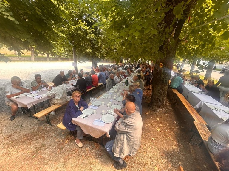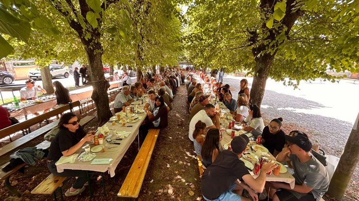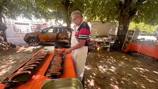 Et le lendemain ....repos ?....eh bien non ! l'association St Laurent a servi 173 repas sous les tilleuls de la place du village. Les convives y ont dégusté les 5 jambons cuits en broche sur place par Bernard Boucher, actif depuis 5h du matin. Ensuite des jeux en musique ont égayé petits et grands.