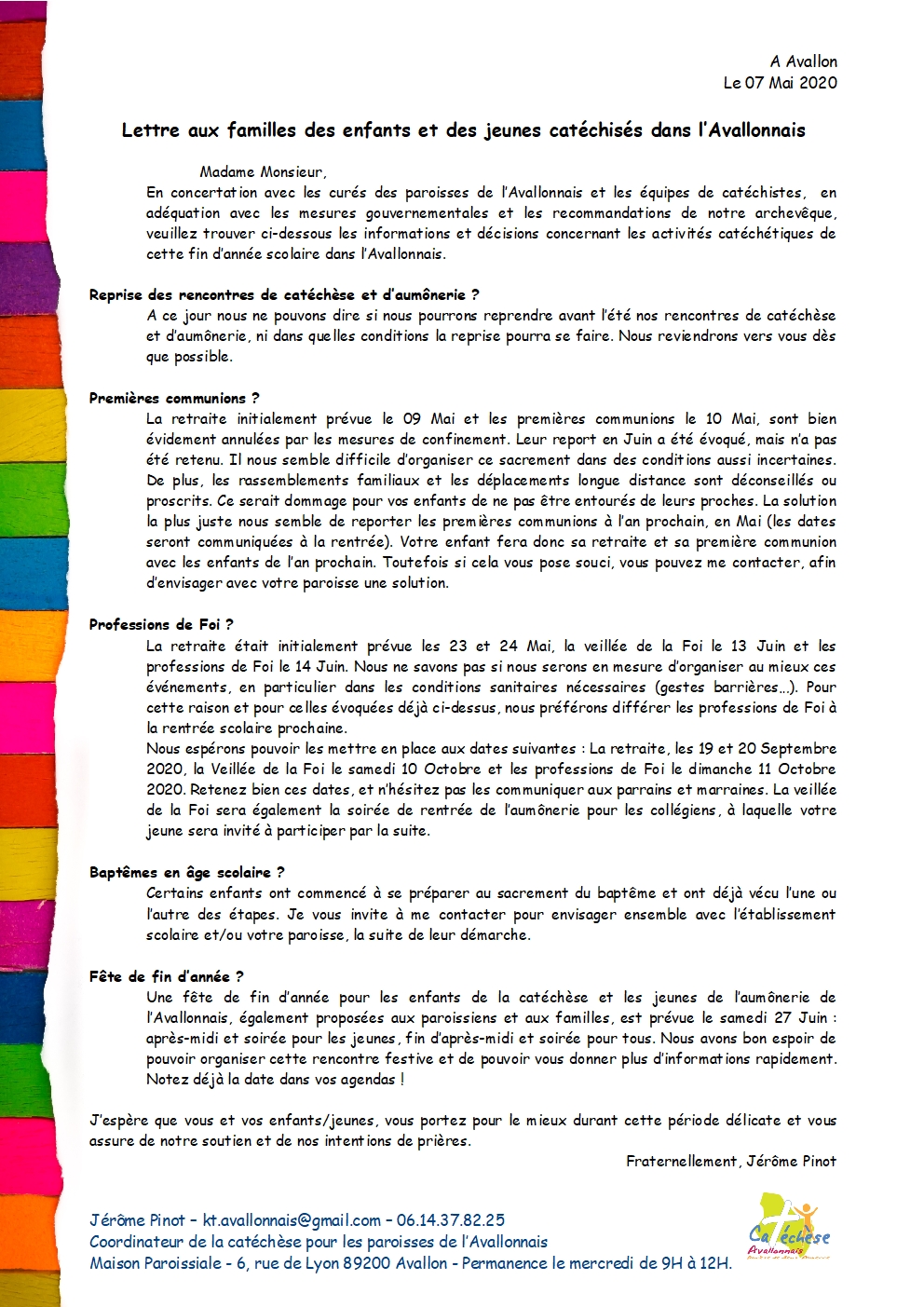 Vous trouverez dans le courrier ci-joint les réponses aux questions que vous nous avez posées et les décisions prises concernant les premières communions et les professions de Foi.