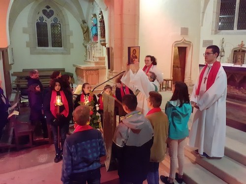 Puis les paroissiens se sont rassemblés à 18h30 pour la messe anticipée du dimanche dans l'église de Cussy les Forges. Les jeunes confirmands faisaient un nouveau pas vers leur confirmation qui aura lieu l'hiver prochain. Ils sont arrivés en procession en entourant le livre de la Parole de Dieu qui a été proclamée solennellement.
