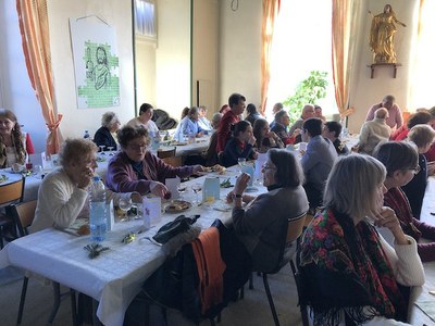 Samedi 14 décembre, nous avons organisé comme chaque année le repas solidaire de la paroisse. Il est offert aux personnes isolées ou en situation de précarité, et une quarantaine de personnes ont répondu à l'invitation. Le menu, terrine de pigeon préparée par Jean-Paul, blanquette de veau venue de la boucherie "Viandes et Terroirs de Bourgogne", fromage et buche de Noël de la boulangerie Grignon, a été apprécié de tous. Il était servi par des jeunes de l'aumônerie. La chorale de Sauvigny le Bois est venue pour terminer le repas en chansons. Les participants ont ainsi pu vivre quelque chose de la joie de Noël. Merci à nos sponsors, Pneu Laurent, Société Schiever et paroissiens donateurs qui nous ont permis d'offrir ce repas.
