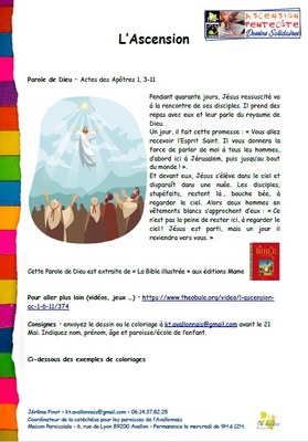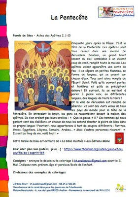 Vous trouverez ci-dessous deux documents : un sur l'Ascension, l'autre sur la Pentecôte. Vous y trouverez une Parole de Dieu, des vidéos et des exemples de coloriages. Lisez, regardez... et à vos crayons (feutres, peinture...). Faites un dessin ou un coloriage sur l'Ascension ou la Pentecôte !