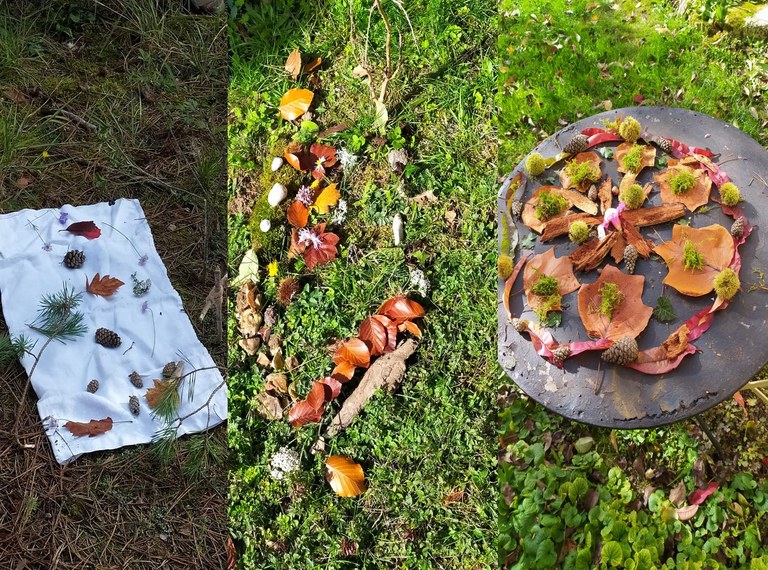 En cours de route, les enfants ont collecté toutes les petites choses que la nature nous offre : feuilles, graines, plumes, cailloux... Toutes ces choses qui émerveillent les enfants et dont, d'habitude, ils remplissent leurs poches (ou celles de leurs parents). Arrivés à l'église de La Postolle, ils ont ensuite réalisé des petits chefs-d'oeuvre éphémères.