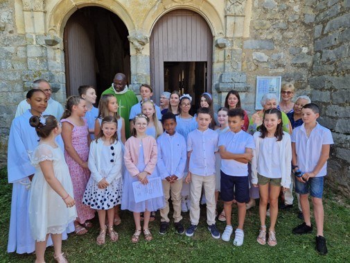 A la fin de la célébration, pendant que les familles prenaient des photos des enfants, de Frédéric notre diacre et du père Nestore sur le parvis, une brioche bénie était distribuée à tous.