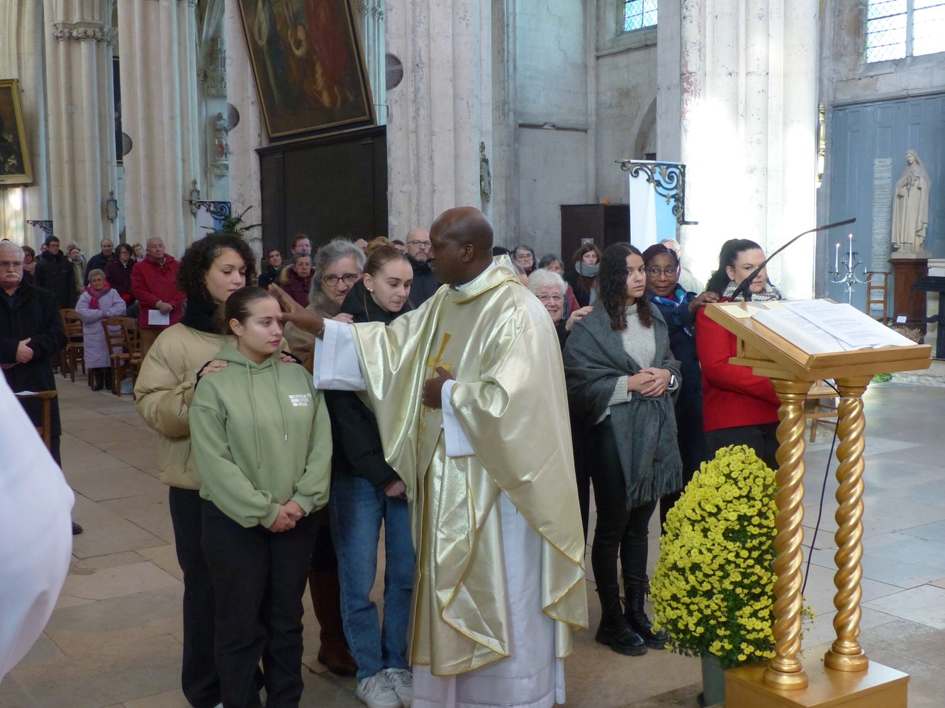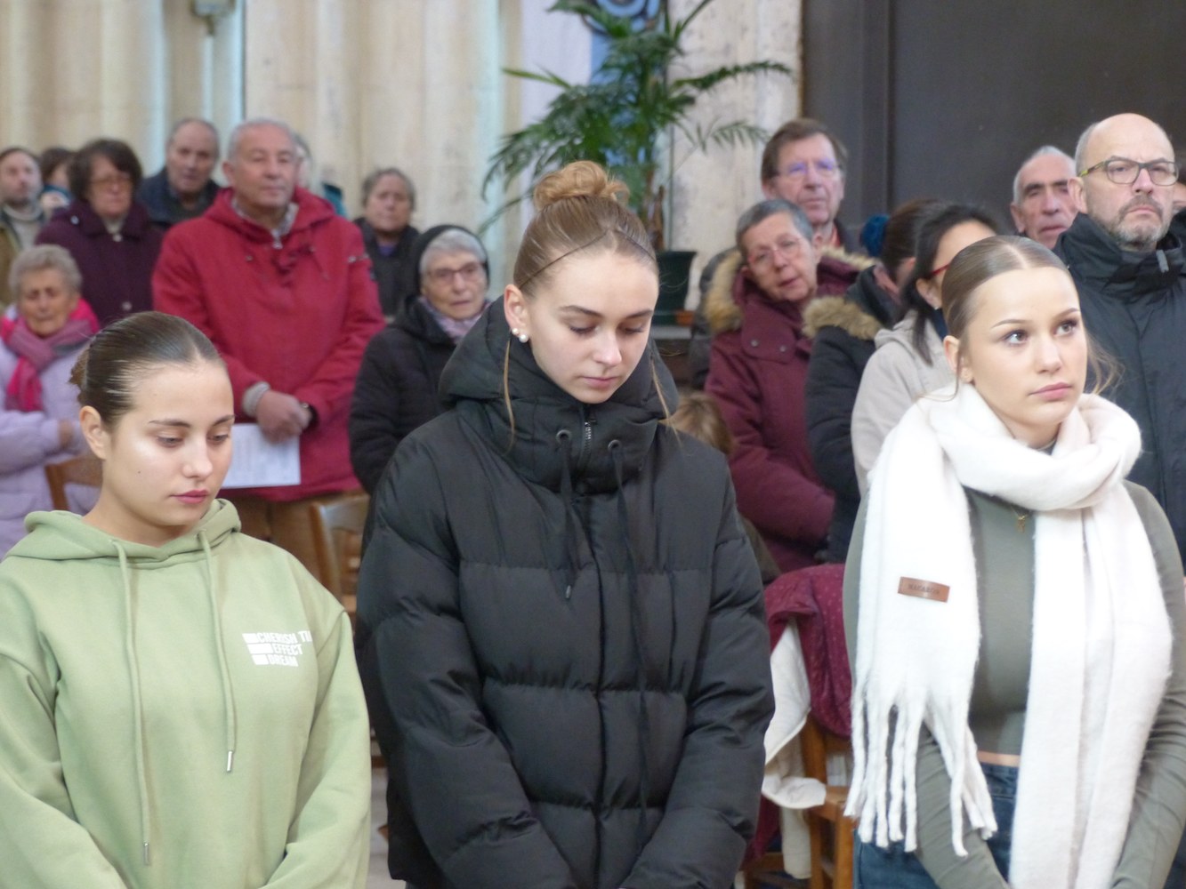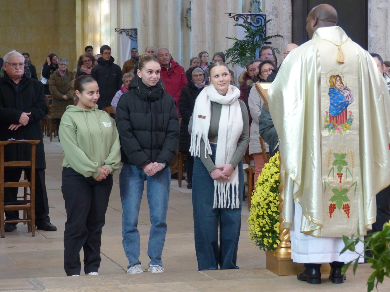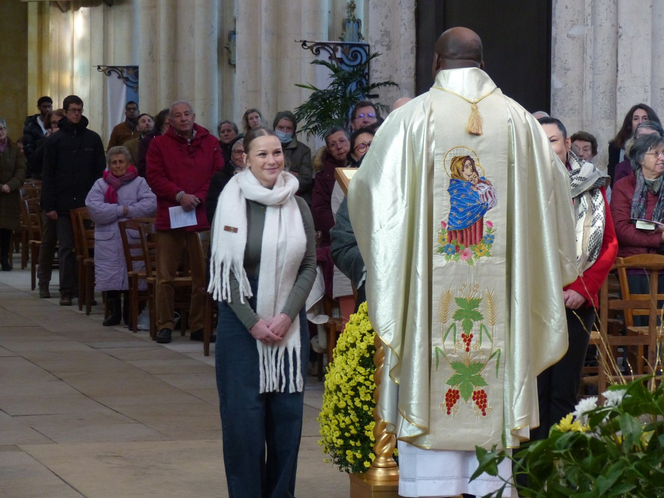 cinq catéchumènes ayant demandé le baptême sont présentés à la communauté chargée de les accueillir et les accompagner par la prière dans le parcours qu’elles ont entamé.
