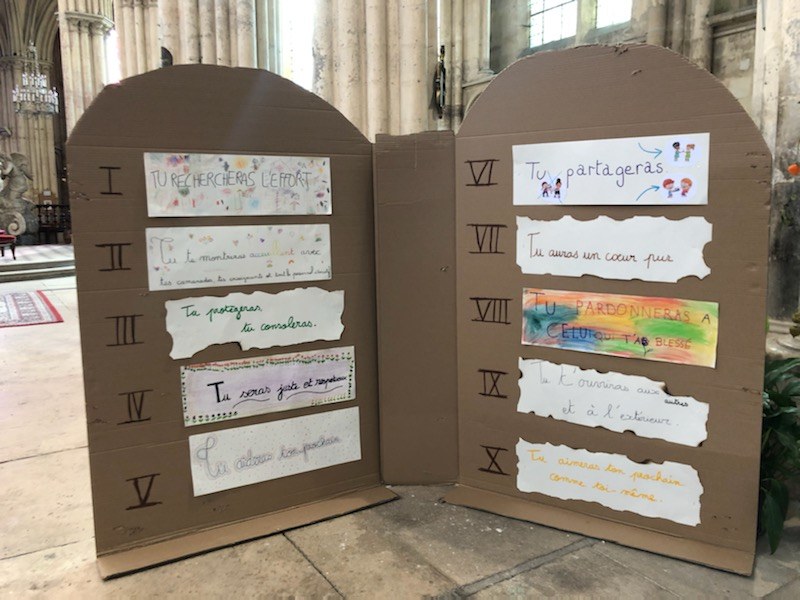 Tous les enfants de l'école catholique Saint-Louis Notre Dame de Villeneuve-sur-Yonne sont venus dans l'église pour la célébration de rentrée. Chaque classe a proposé un commandement de vie en commun. Et Jésus dans l'Évangile nous a donné le 10e qui résume tous les commandements : aimer son prochain comme soit même.