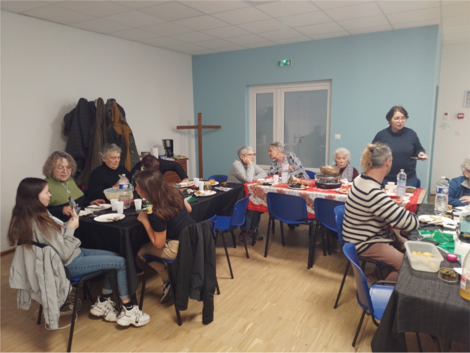 C’est entre Noël et la fin de l’année 2022 que le café-sourire du Secours Catholique s’est retrouvé pour un repas-raclette très fraternel, quelques jeunes personnes ont animé de leur musique et de leurs sourires cette rencontre qui a fait chaud au coeur de ceux qui étaient seuls pour les fêtes….