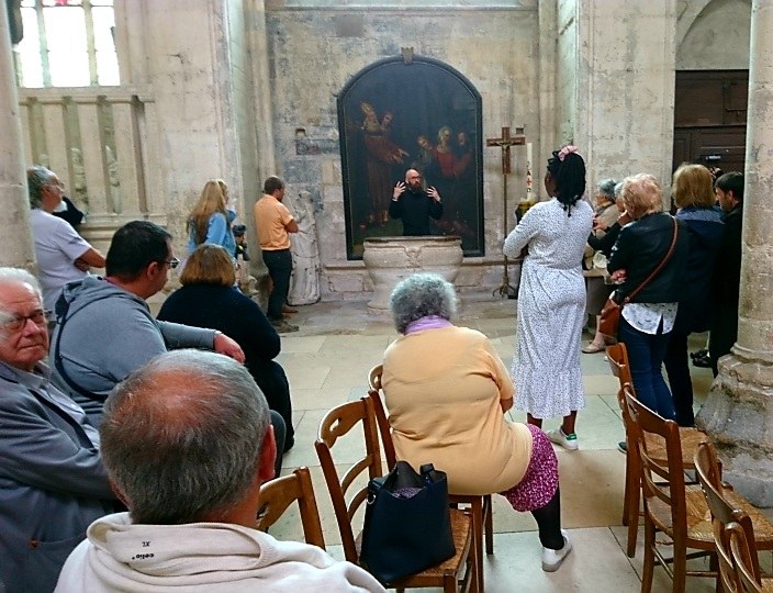 Belle journée mystagogique que ce dimanche du Sacré-Cœur, commencée par la messe qui a rassemblé les catéchumènes du diocèse et leurs accompagnants. Un repas partagé à la maison paroissiale a permis à tous de faire connaissance avant un retour à l'église où nous avons profité d'une visite guidée par le P.Romain sur le thème de la liturgie. L'après-midi s'est terminée autour de la Mise au tombeau, avec des explications lues par Corinne VETTIVELU et des observations par le P.François CAMPAGNAC qui invoqua sur nous la bénédiction de Dieu, afin d'assurer notre vocation de baptisés : recevoir l'autre comme un don.