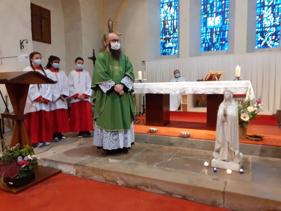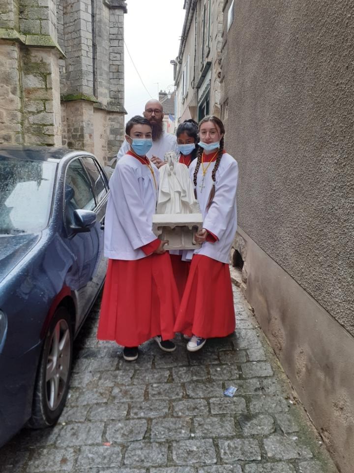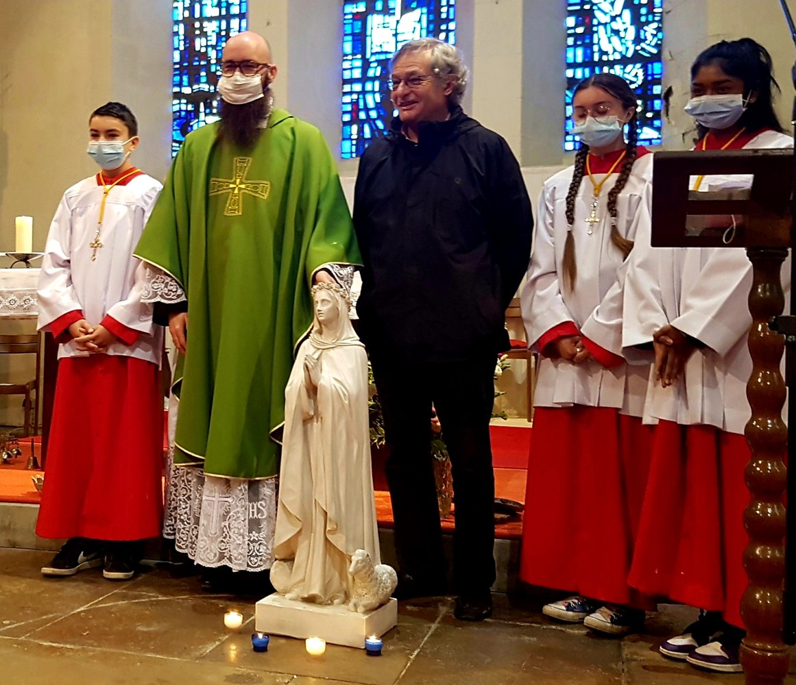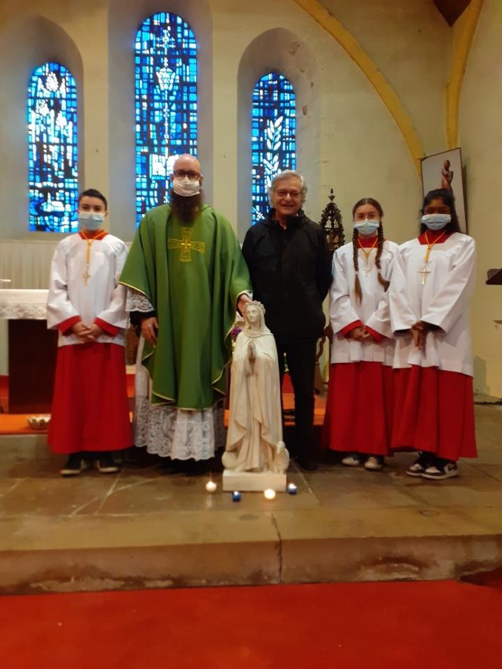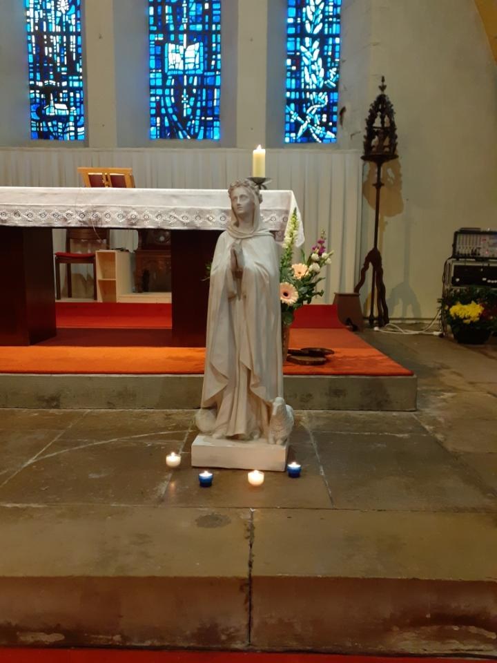 La statue de Saint Alpais qui avait déjà conquis le cœur des jeunes de l'aumônerie en avril avait aujourd'hui une place de choix dans l'église de Villeneuve sur yonne grâce à la paroisse Sainte Colombe de Sens.