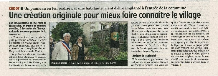 Un panneau en fer, réalisé par une habitante, vient d'être implanté à l'entrée de la commune. Sainte Alpais est représentée sur le sommet de cette œuvre. Monsieur le Maire annonce pour 2022 une vitrine sécurisée pour présenter le trésor de la Sainte.