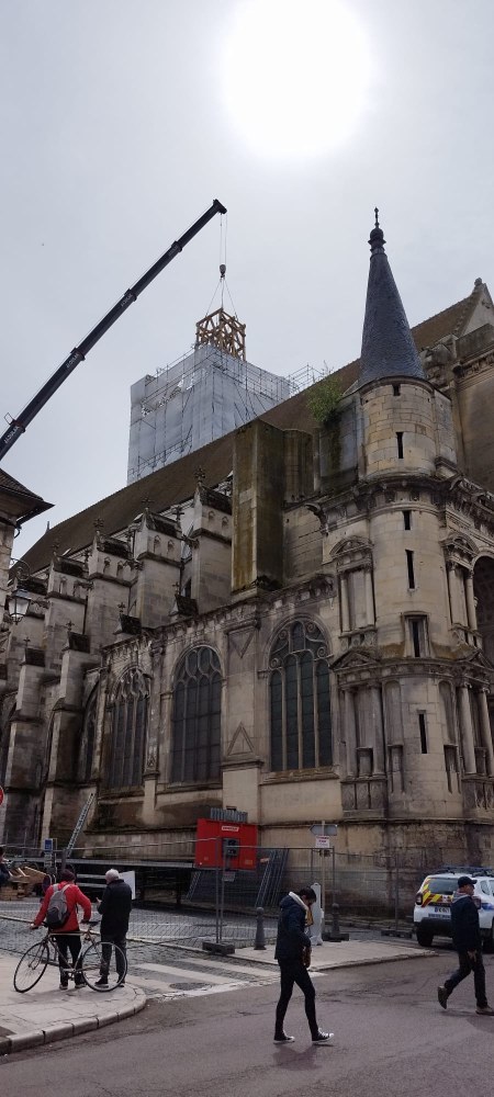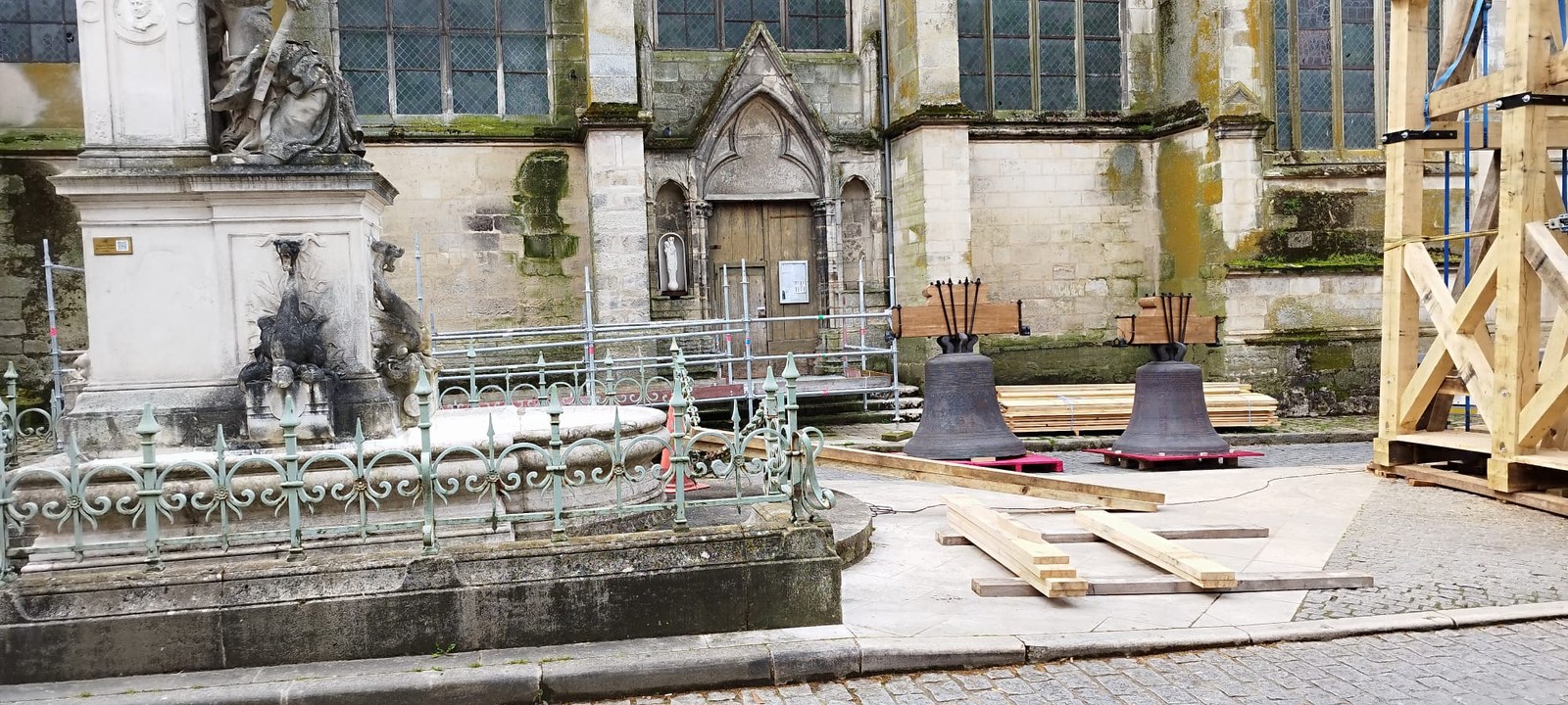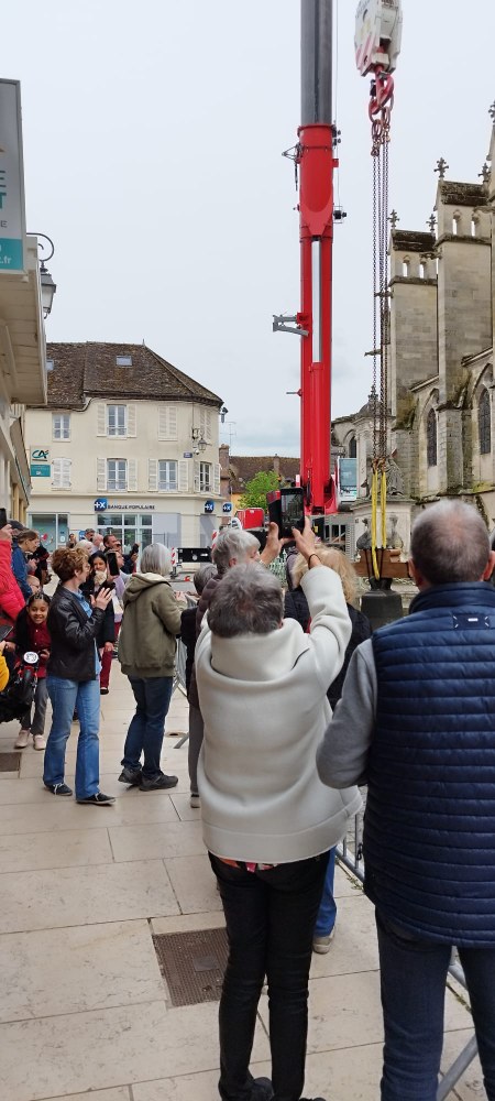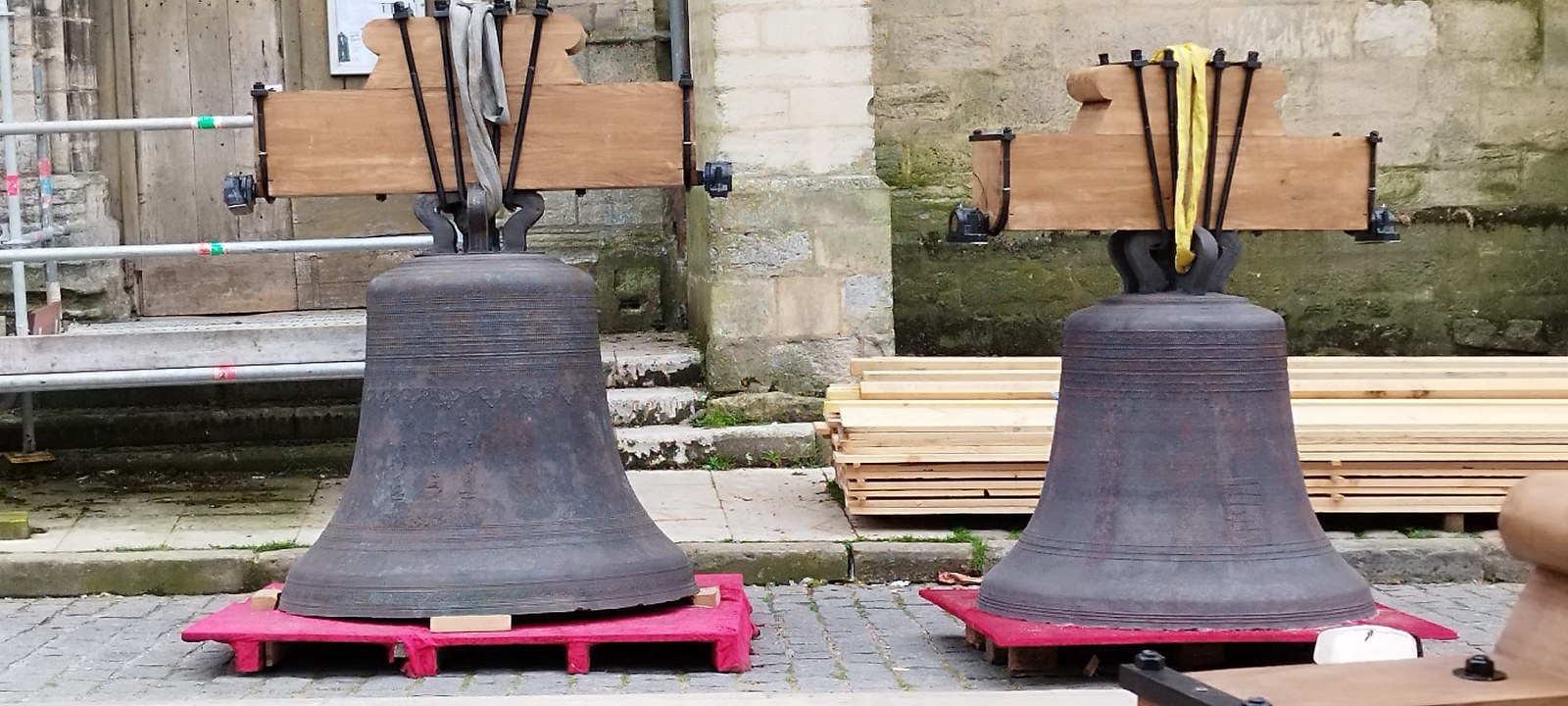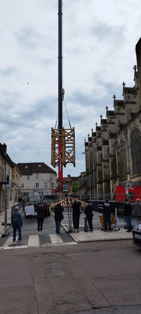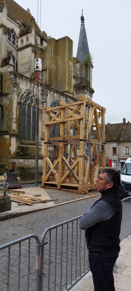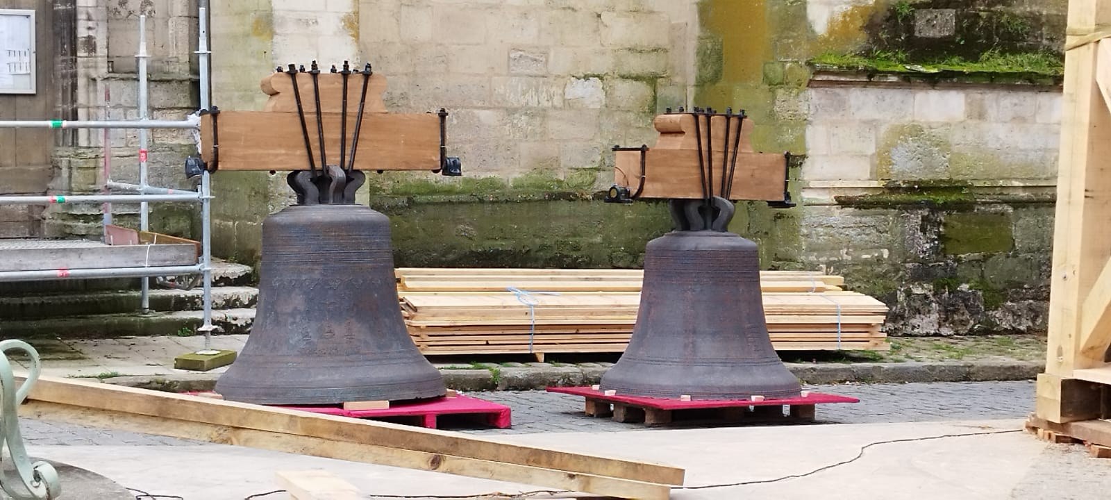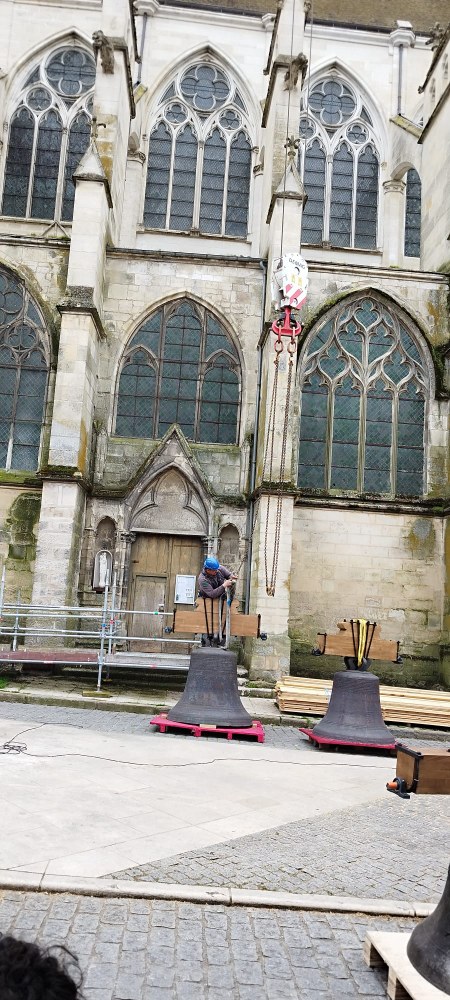 Les trois cloches Marie-France, Pierre Rozier et Henri Dieudonné sont de retour ! lundi 29 avril en fin de matinée, le nouveau beffroi a été posé, puis ce fut le tour des cloches de prendre leur envol une à une pour être installées, ainsi que la charpente qui supportera la couverture.