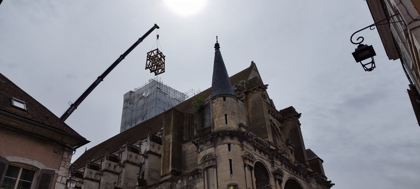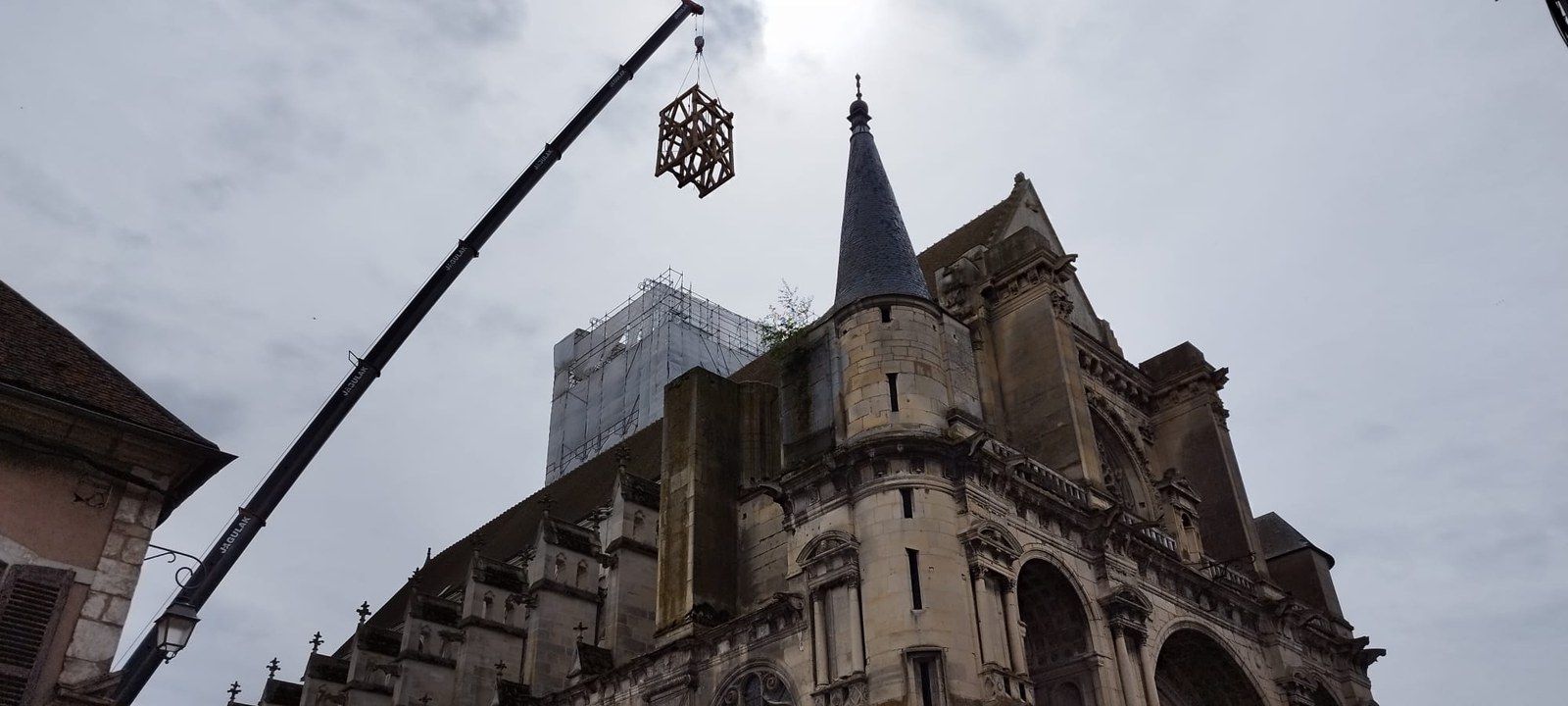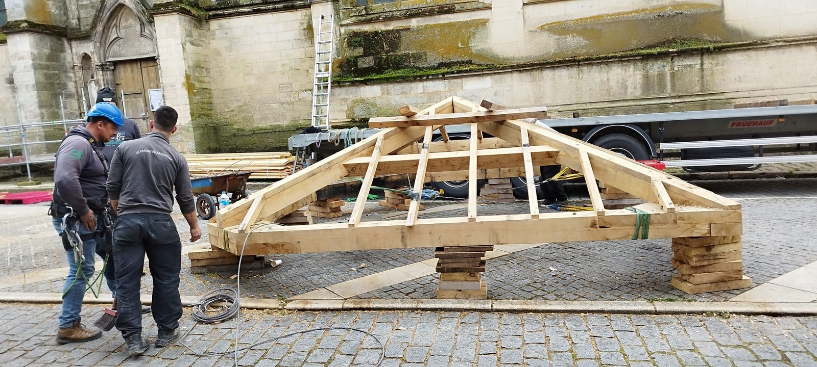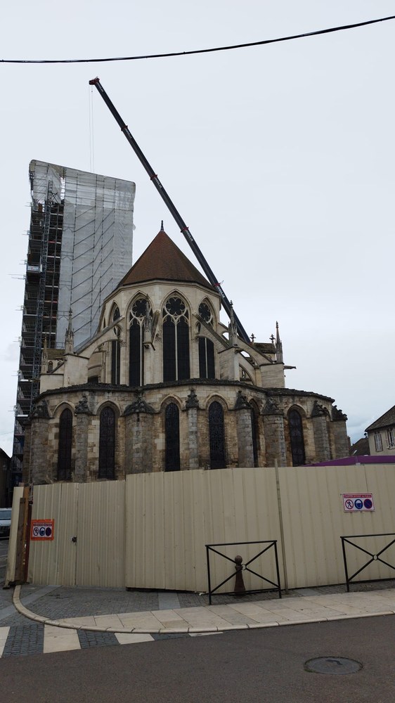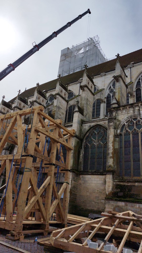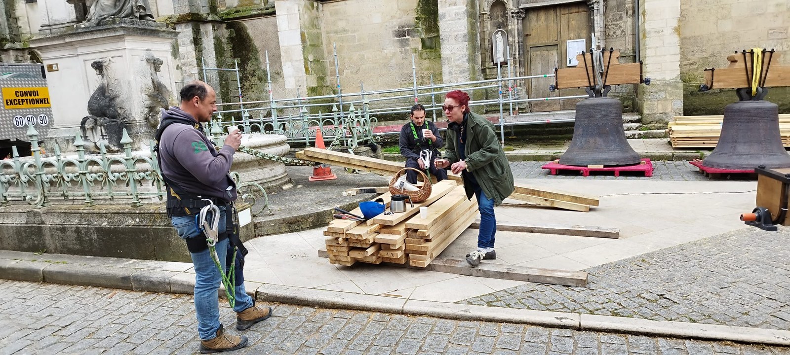 Les trois cloches Marie-France, Pierre Rozier et Henri Dieudonné sont de retour ! lundi 29 avril en fin de matinée, le nouveau beffroi a été posé, puis ce fut le tour des cloches de prendre leur envol une à une pour être installées, ainsi que la charpente qui supportera la couverture.