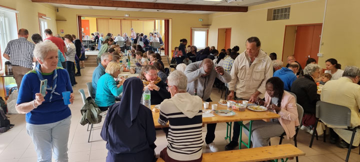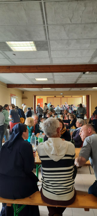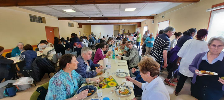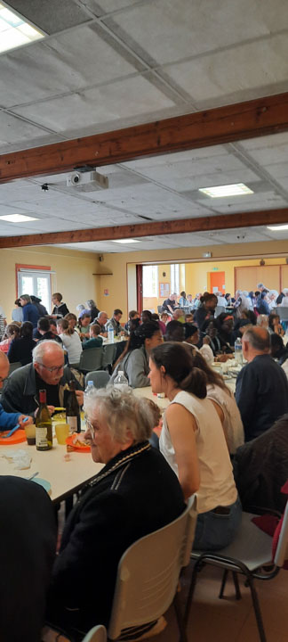 La salle municipale est comble pour partager le repas tous ensemble, heureusement, la pluie qui s’est invitée ne gêne pas encore ceux qui mangent au dehors pour être plus à l’aise.